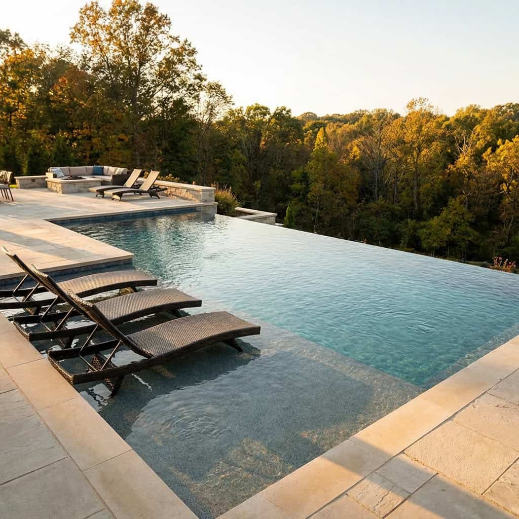 The infinity edge does something almost unfair. It tricks the eye into believing the pool runs straight into the trees, the lawn, or the horizon line beyond it.
