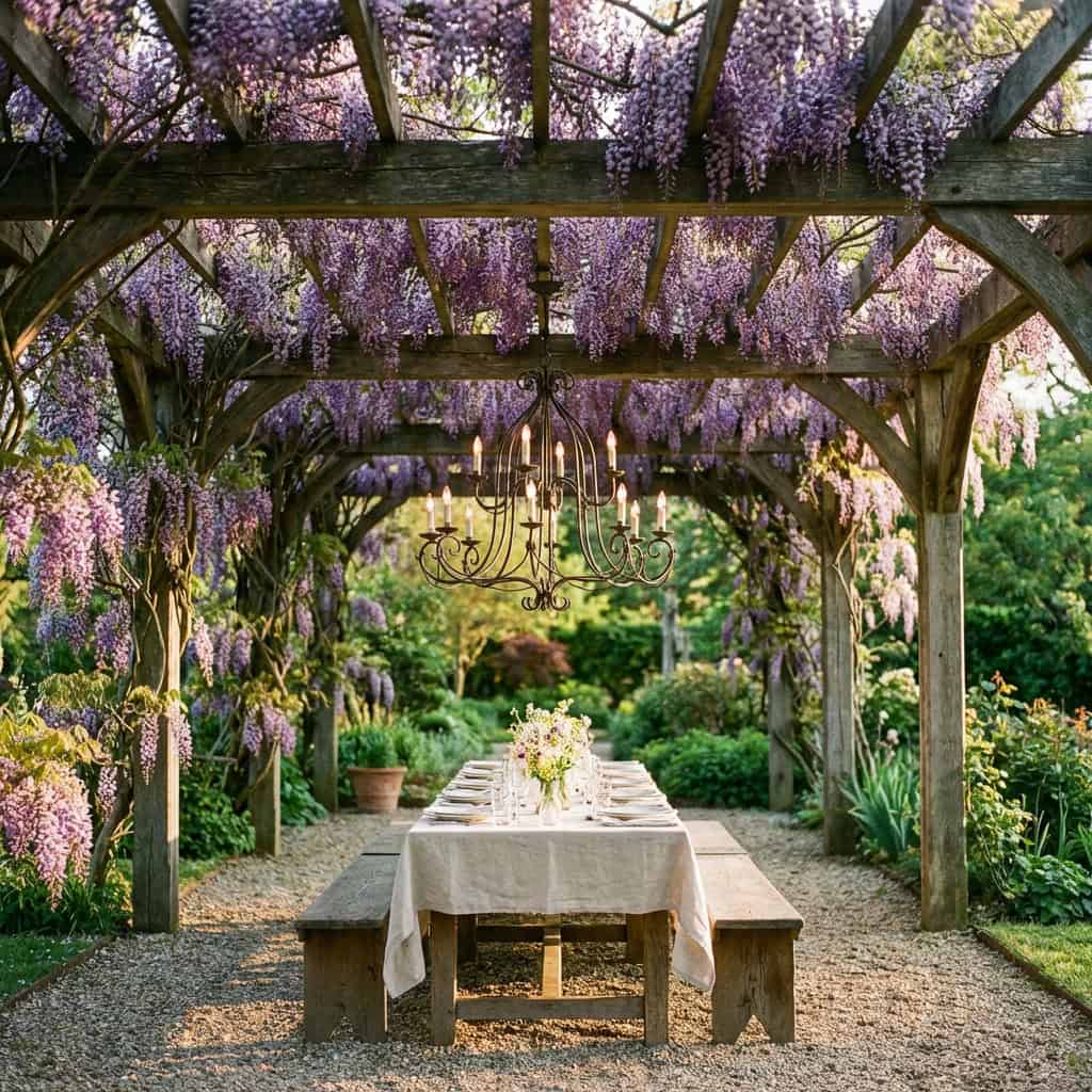 5. The Pergola Draped in Wisteria with Chandelier