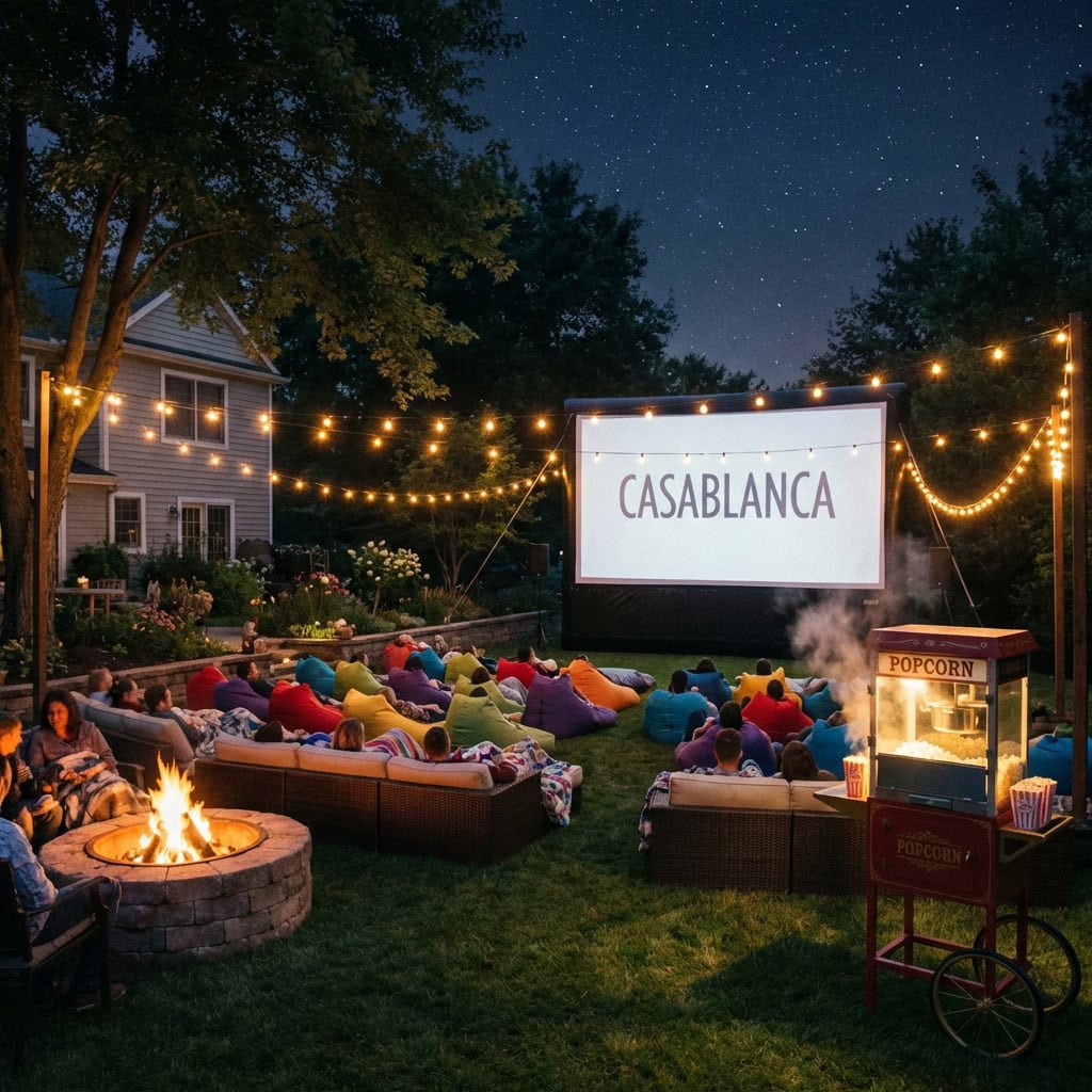 Add a popcorn cart, a beverage cooler within reach, and a fire pit off to the side for chilly nights. The movie almost becomes the excuse to be out there.