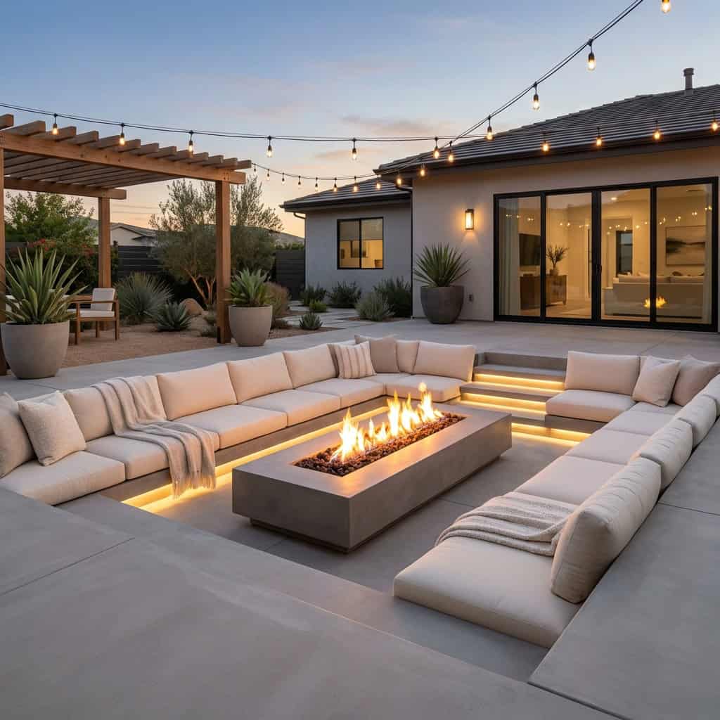 The seating wraps the fire table on three or four sides, low and modular and cushioned. You step down into it from the patio, which makes the whole thing feel like a discovered space.