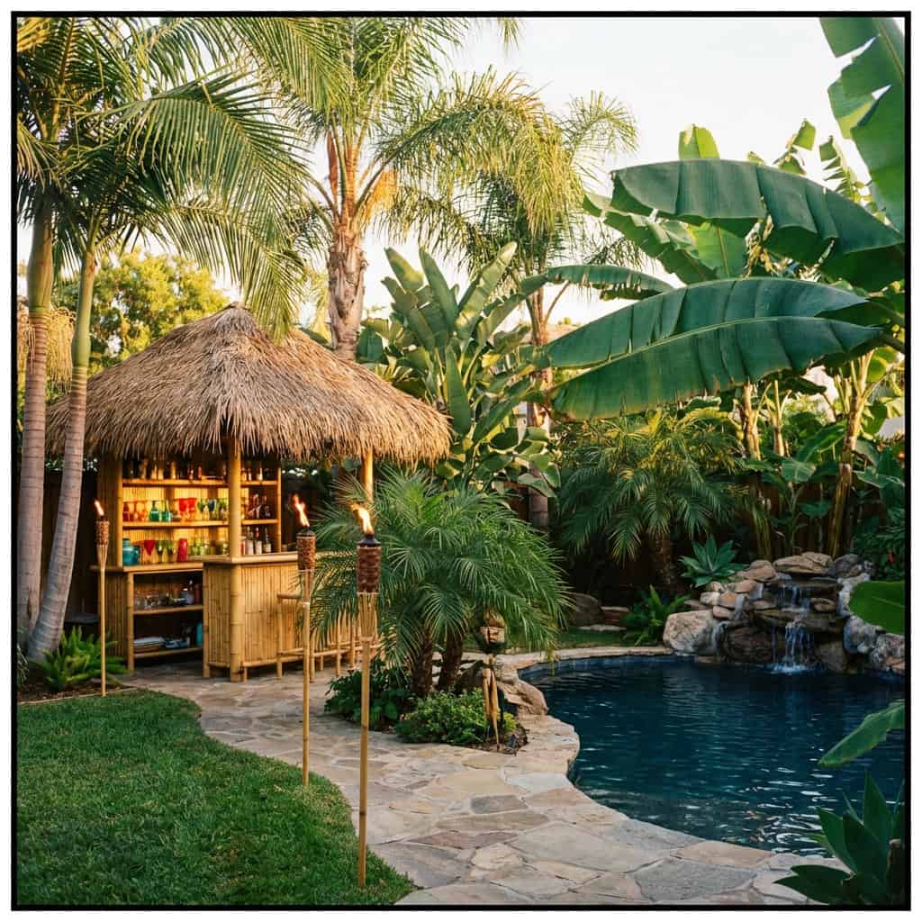 Palm trees, banana plants, and bird of paradise framing every sightline. A tiki bar with a thatched roof in the corner, stocked with the right glassware and the right rum. Tiki torches lining the path.