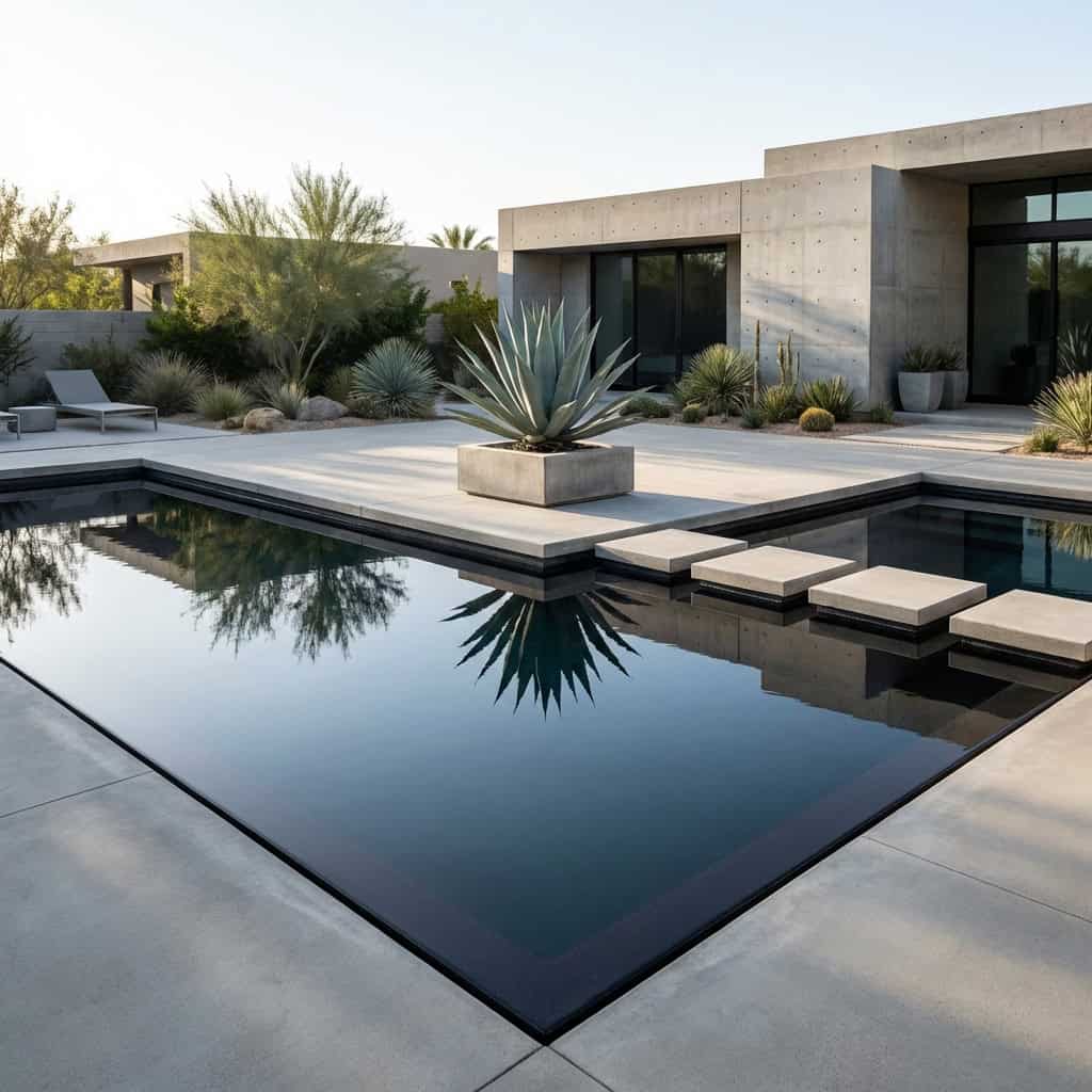 Around the pool, clean concrete, minimal landscaping, and one or two architectural plants like a sculptural agave or a tall ornamental grass. Nothing competes with the water.