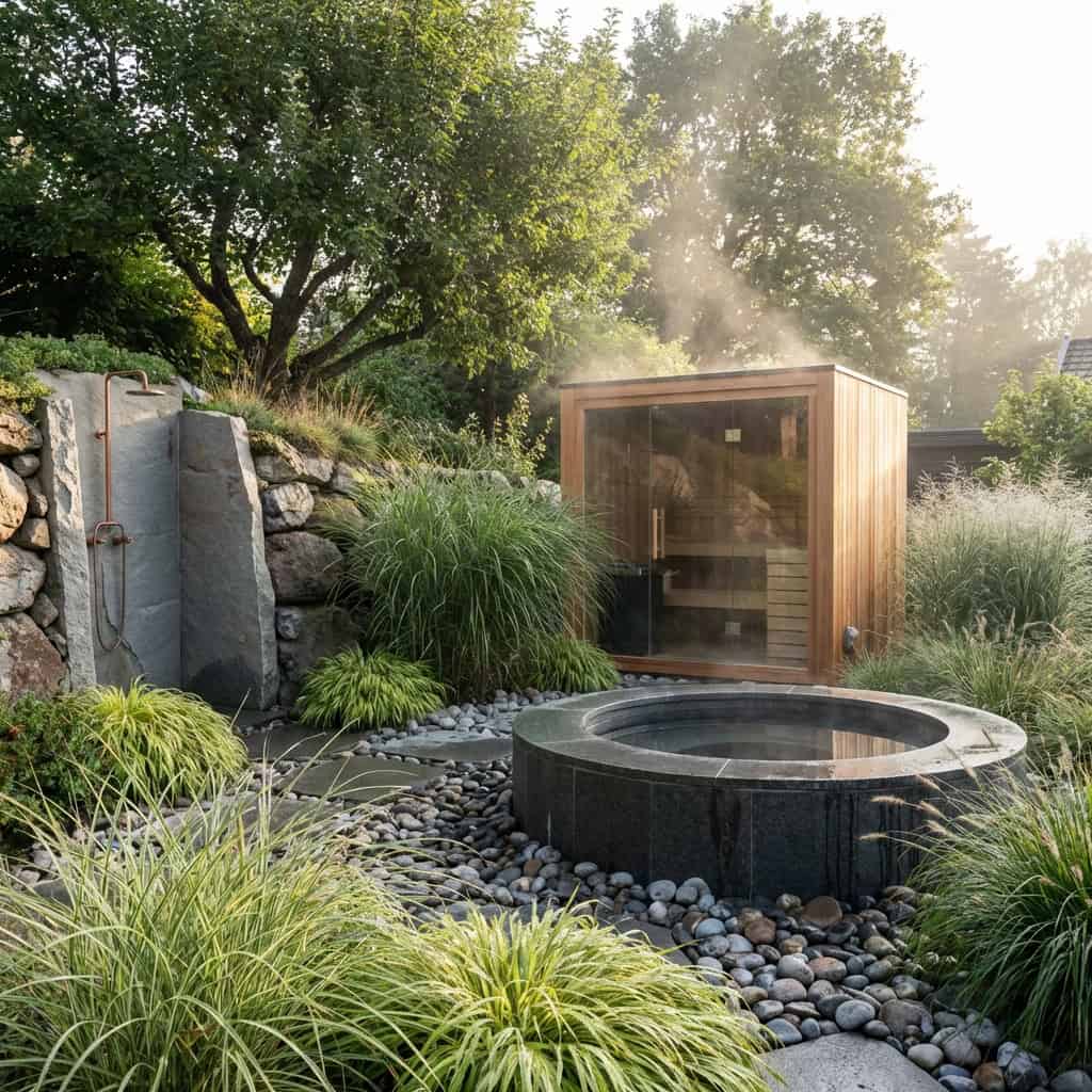 A small cold plunge pool sits next to a cedar sauna, both surrounded by river stones and ornamental grasses. The contrast between the two is the whole point.