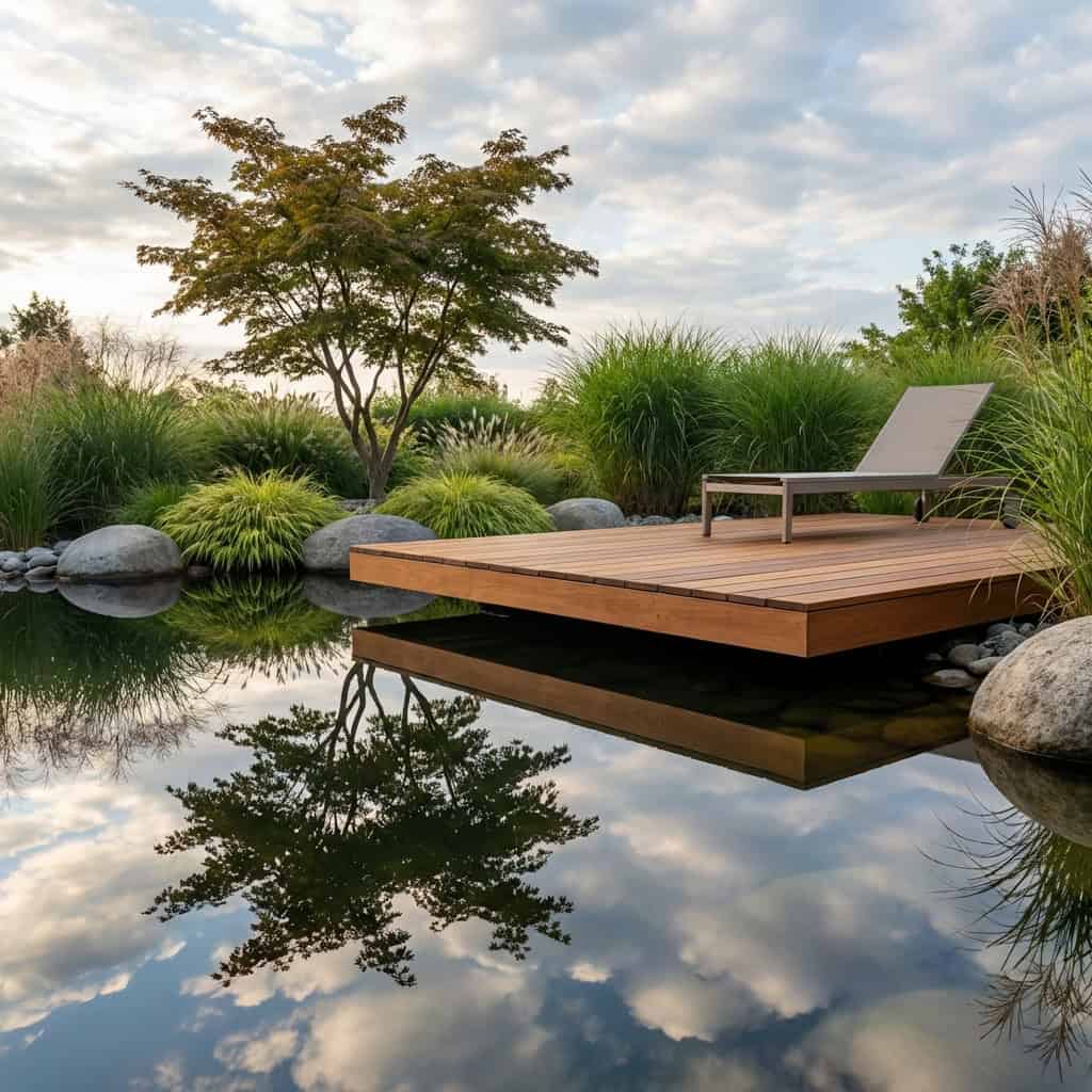 Around the pond, ornamental grasses, a few smooth boulders, and maybe a single sculptural tree. The reflection does most of the visual work.