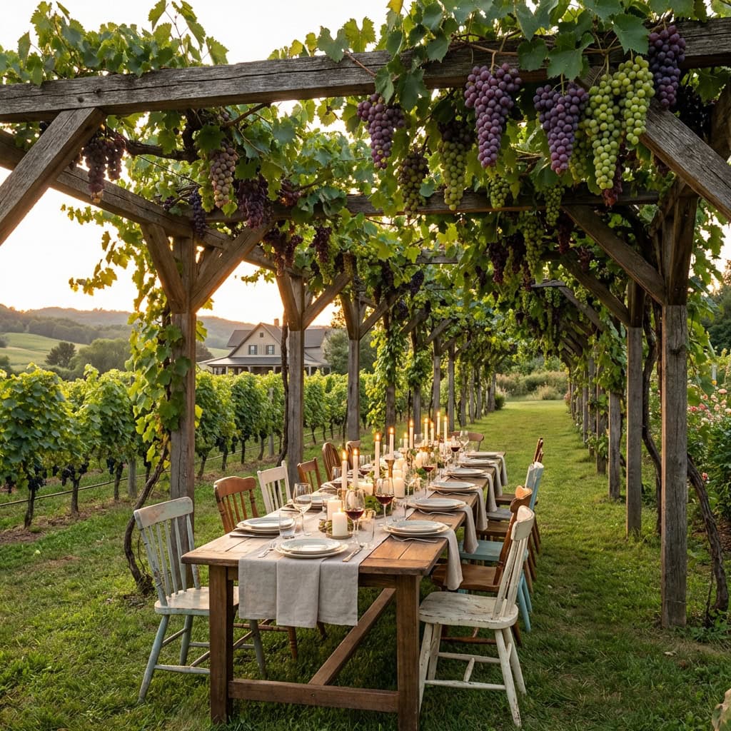 A long grape arbor stretches over a stone or gravel patio, with mature grapevines twisting up the posts and across the top. In late summer, the grapes hang down in clusters over the table.