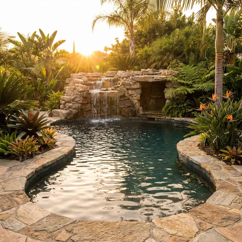 The pool is shaped like a natural lagoon — irregular edges, dark interior, surrounded by lush tropical planting. A waterfall tumbles down a stack of stacked stone at one end, and a small grotto tucks behind it.