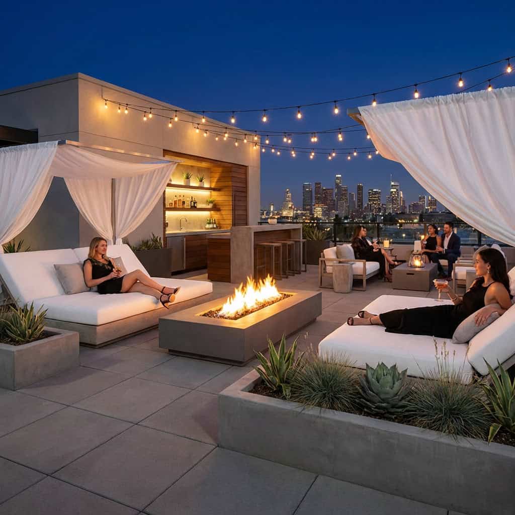 25. The Rooftop-Style Backyard with Lounge Beds and Fire Pits