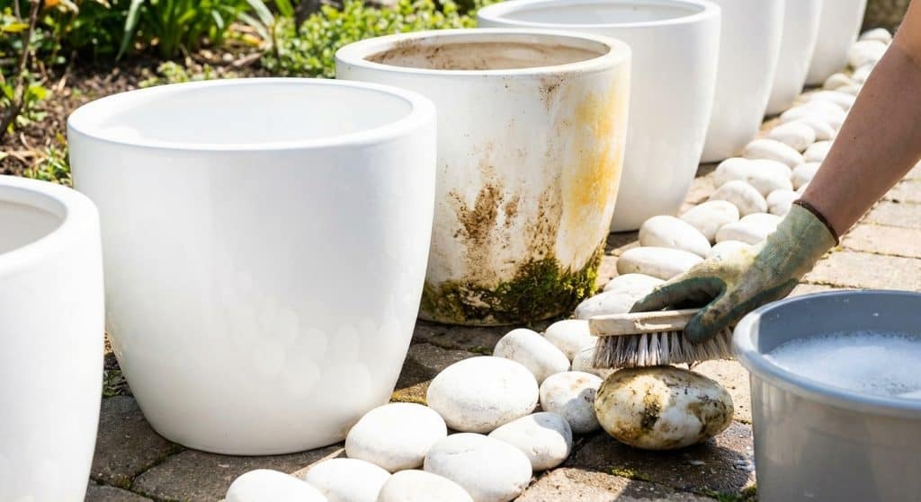 White planters and stones look crisp and clean. They stand out visually.