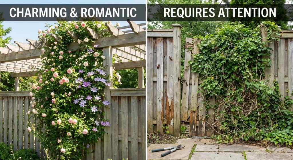 Once established, many climbing plants grow aggressively. They tangle, trap moisture, and creep into unwanted areas.