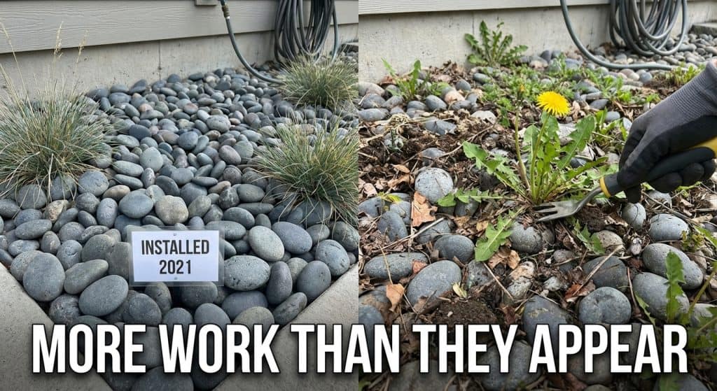 Over time, leaves, dirt, and organic debris settle between the rocks. Weeds eventually appear, and pulling them becomes harder than dealing with soft soil.