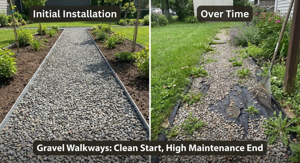 Gravel walkways look clean, modern, and low-maintenance when they’re first installed. They’re often chosen as a simple alternative to concrete or pavers.